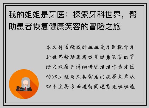 我的姐姐是牙医:探索牙科世界,帮助患者恢复健康笑容的冒险之旅