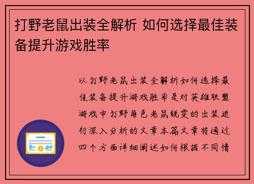 打野老鼠出装全解析 如何选择最佳装备提升游戏胜率